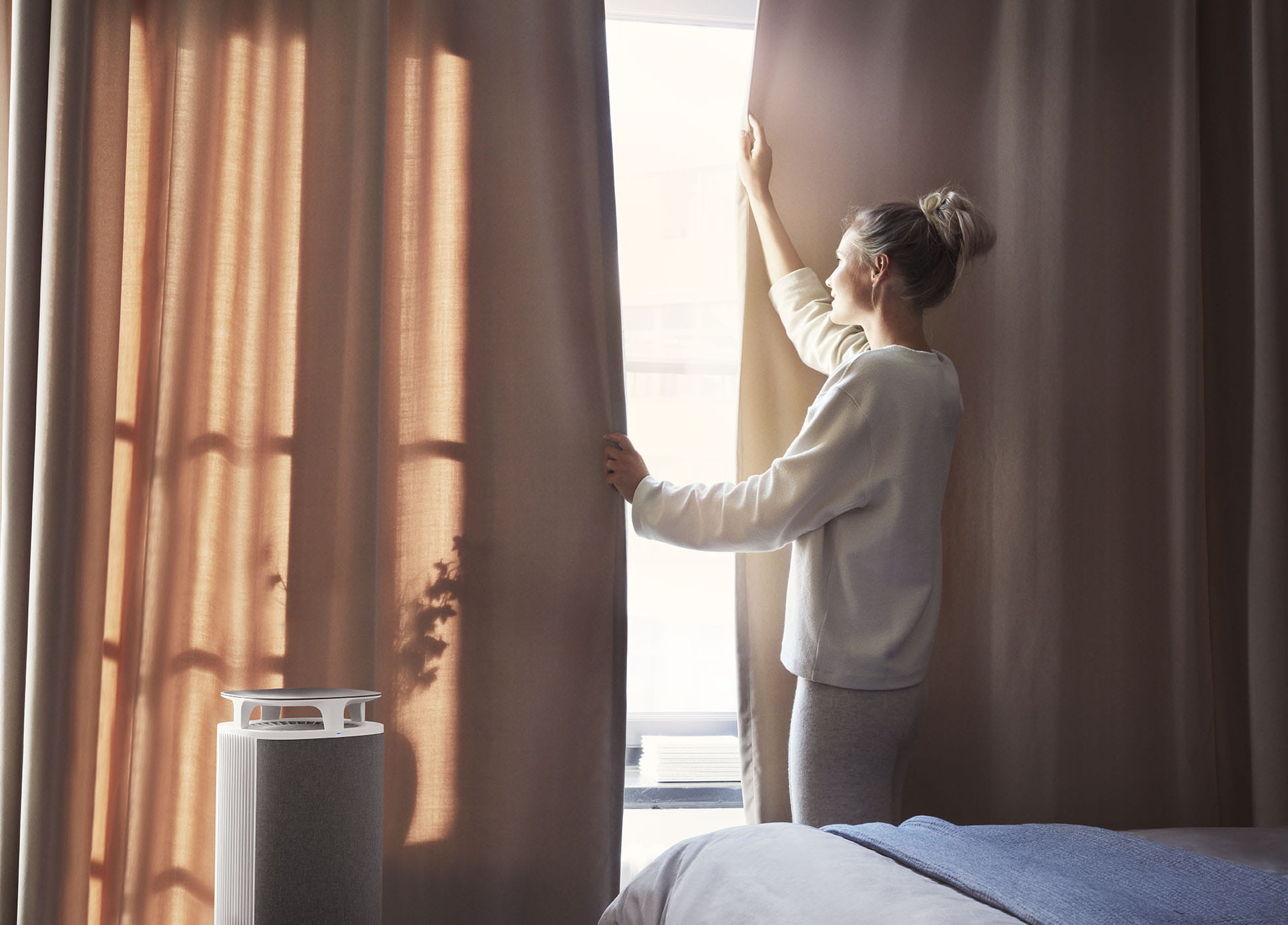 Uruchomienie trybu Auto sprawi, że oczyszczacz powietrza automatycznie dostosuje się do poziomu zanieczyszeń w pomieszczeniu. Wentylator, w oparciu o odczyty czujnika, płynnie przechodzi do wyższej prędkości i zwalnia, gdy powietrze ponownie jest czyste.