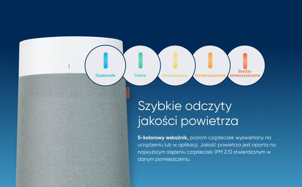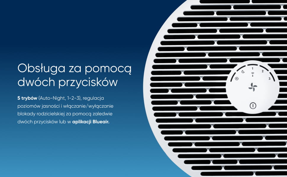 Łatwo monitoruj jakość powietrza dzięki wskaźnikowi 5 kolorów i dostosuj ustawienia za pomocą prostego interfejsu z dwoma przyciskami. Zawiera tryb automatyczny, tryb nocny, regulację jasności i blokadę rodzicielską dla dodatkowej wygody.