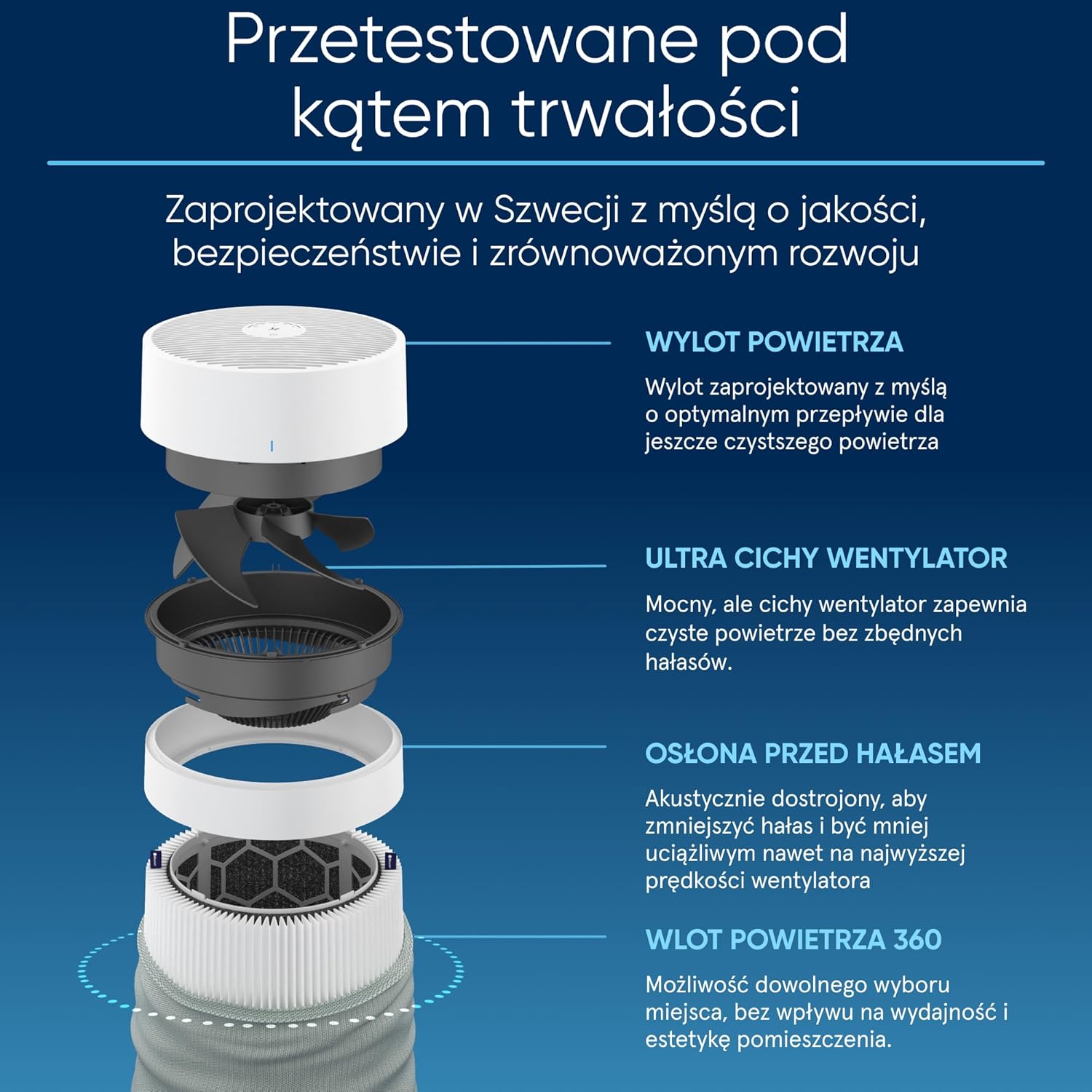 Usuwa 99,97% cząstek unoszących się w powietrzu o wielkości zaledwie 0,1 mikrona, w tym wirusy, dym, sierść zwierząt, pyłki, pleśń, alergeny i kurz. Wbudowany filtr węglowy neutralizuje zapachy z gotowania, zwierząt domowych i dymu, pozostawiając świeże i czyste powietrze.