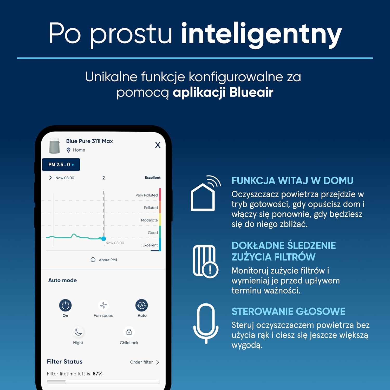 Pozostań w kontakcie dzięki aplikacji Blueair, która umożliwia monitorowanie jakości powietrza, ustawianie harmonogramów i korzystanie z geofencingu w celu spersonalizowanej wydajności. Aplikacja oferuje również technologię RealTrack do precyzyjnego śledzenia filtra. Kompatybilna z asystentami głosowymi dla wygodnej obsługi bez użycia rąk.