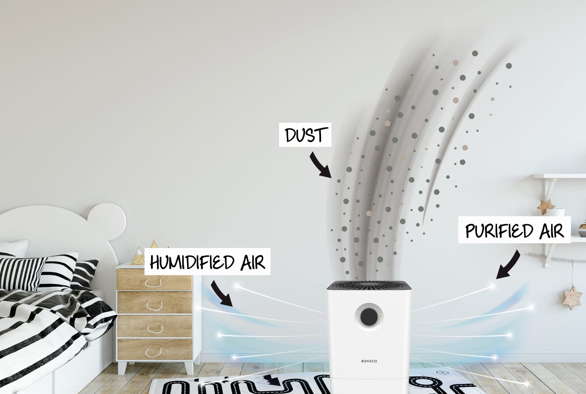 BONECO W200 to urządzenie, które nawilża i dodatkowo czyści powietrze, a wręcz „pierze” je niczym pralka. Konstrukcja tego oczyszczacza powietrza z funkcją nawilżania opiera się na innowacyjnej macie umieszczonej na obrotowym bębnie. Mata nie tylko oddaje do pomieszczenia wilgotne powietrze, ale i oczyszcza je z większych cząsteczek, pyłków i kurzu. Dzięki temu powietrze w pomieszczeniu, w którym pracuje BONECO W200 jest czyste i rześkie niczym po ulewnym deszczu.