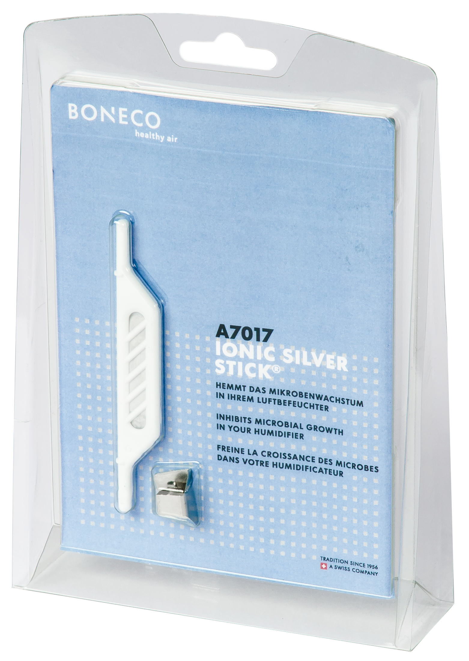 Srebrna Elektroda BONECO Ionic Silver Stick® to innowacyjne rozwiązanie do utrzymywania wody w idealnej czystości, wykorzystujące bakteriobójcze właściwości srebra. Ionic Silver Stick® rozpoczyna swoje działanie jak tylko wejdzie w kontakt z wodą. Elektroda uwalnia jony srebra likwidując bakterie, grzyby i inne mikroorganizmy. Działa także wtedy, kiedy urządzenie jest wyłączone.