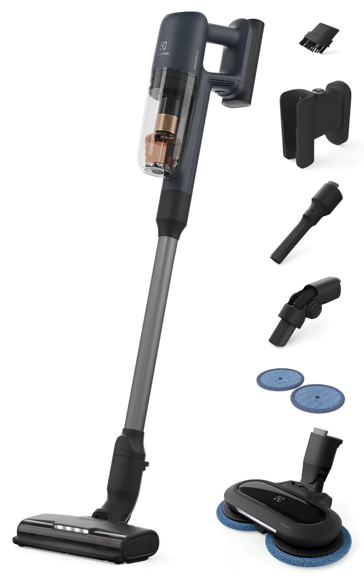 W komplecie z odkurzaczem pionowym 2w1 otrzymasz: elektroszczotkę do dywanów i podłóg twardych z oświetleniem LED PowerPro multi-surface, elektorszczotkę mopującą PowerPro MOP, szczotkę do kurzu, szczotkę szczelinową, łącznik kątowy, ładowarkę, 4 pady z mikrofibry. Łatwy dostęp do odkurzacza ręcznego oraz dołączone akcesoria, pozwalają na dokładne i szybkie odkurzanie różnych powierzchni - od podłogi po trudno dostępne zakamarki.