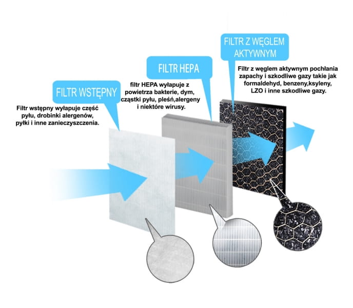 Filtr 3-stopniowy: filtr wstępny + wysokowydajny filtr HEPA + filtr z węglem aktywnym