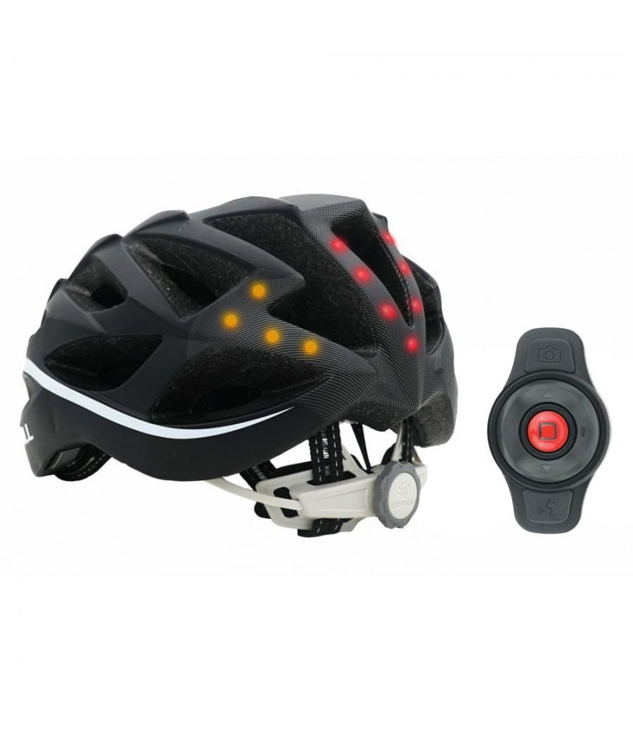 Nie musisz już puszczać kierownicy i podnosić lub wystawiać ręki, aby zasygnalizować innym zamiar skrętu. Wciśnij odpowiedni przycisk na pilocie przy kierownicy, aby rozświetlić światło kierunkowe po prawej lub lewej stronie kasku, w zależności od wybranego kierunku jazdy.