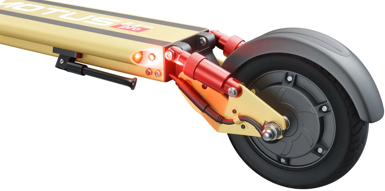 Model hulajnogi elektrycznej Motus Bella Ride orange ma amortyzowane koła z obu stron. Dzięki temu łatwiej wjedziesz na krawężniki oraz wyboje, a także bez problemu z nich zjedziesz.