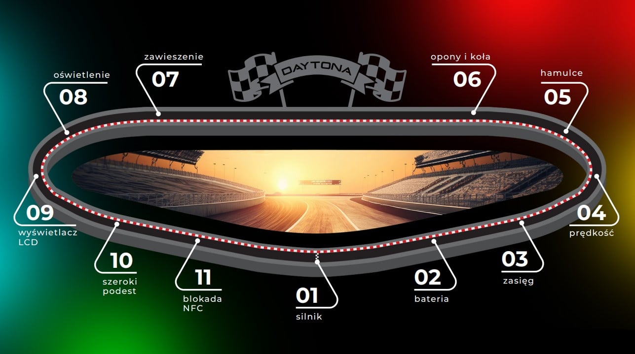 Motus PRO10 Sport Daytona to model stworzony dla ludzi z pasją, którzy nie boją się żadnych wyzwań. Jego dzika i buntownicza natura zapewni ekstremalne emocje, jak podczas rajdów samochodowych. Pojazd dedykowany jest osobom, które chcą od życia czegoś więcej i potrafią przekraczać własne granice. To moc, bezpieczeństwo i technologia w jednym, która spełni oczekiwania nawet najbardziej wymagających użytkowników. Poczuj zew prawdziwej przygody i odkryj sportowe oblicze elektromobilności.